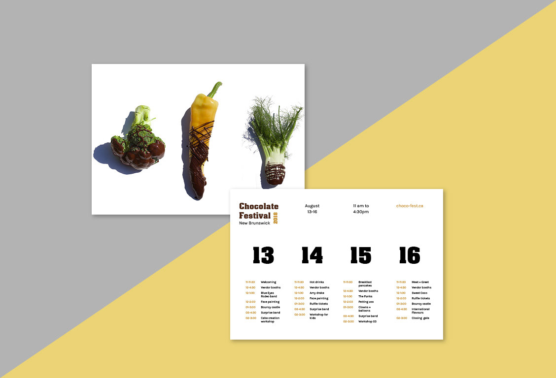 I wanted to create a playful branding campaign that promotes the Chocolate Festival in New Brunswick. I went along with the concept of dipping vegetables in chocolate as a way to attract the viewer's attention. The idea was inspired by how most kids will eat anything that has chocolate in it. I grew up hearing parents say "if you eat your vegetables at dinner time, you can have a treat". This sentence was the inspiration starting point to developing this concept, using humour as a marketing tool.